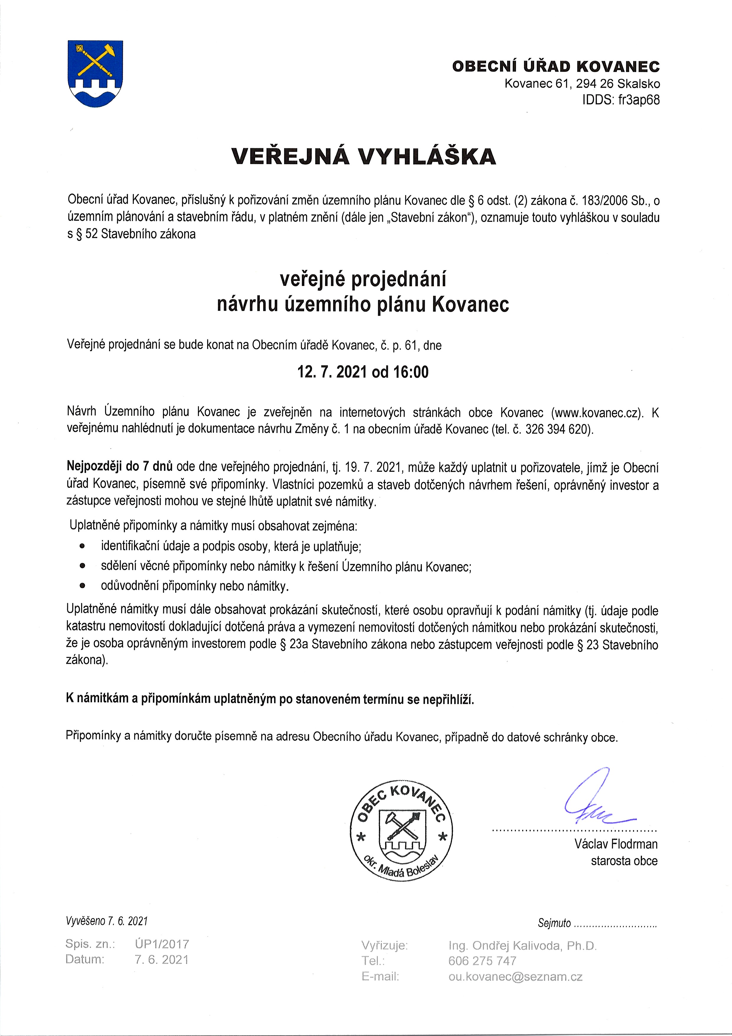 Vyhláška veřejného projednání územního plánu Kovanec